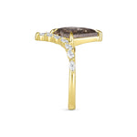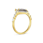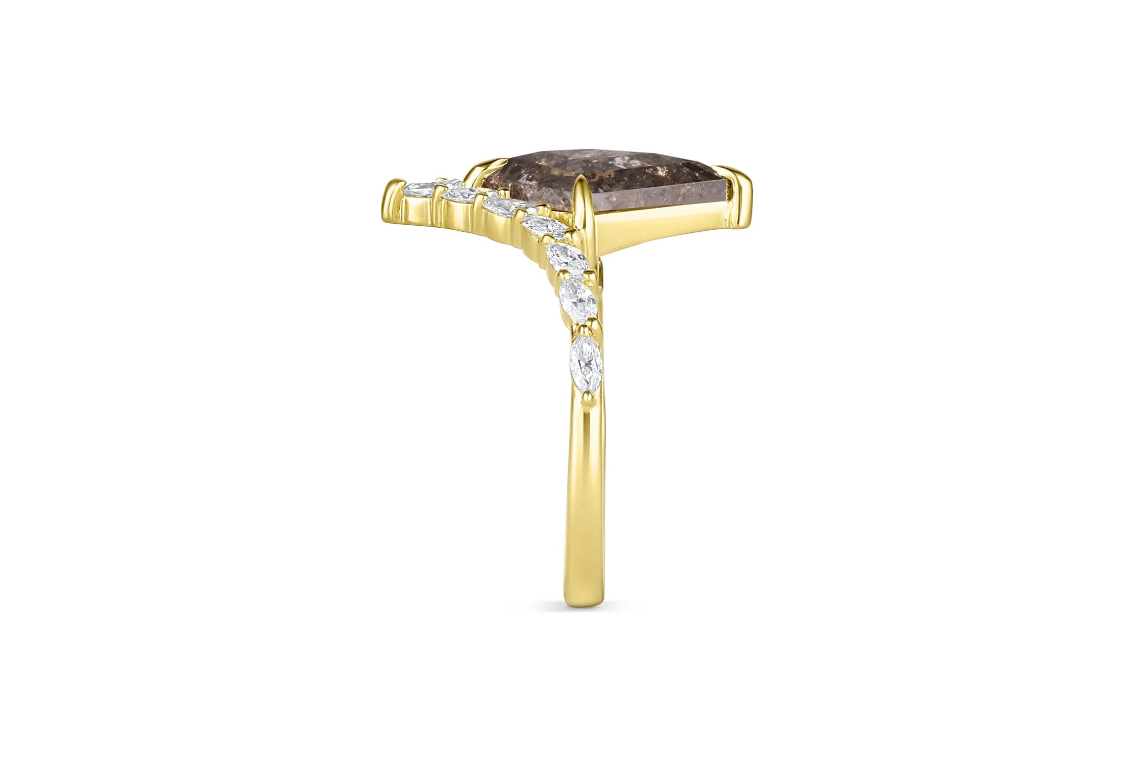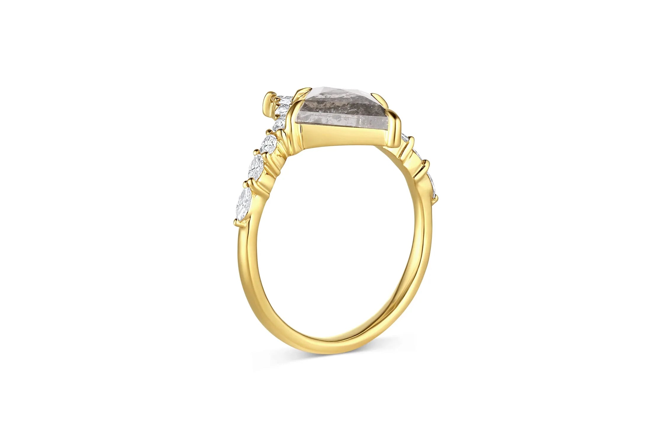 This ring features a 1.58ct kite salt & pepper diamond accented with marquise white diamond melee (.32cttw). The ring is 14k yellow gold and size 6, but can be adjusted slightly if needed.