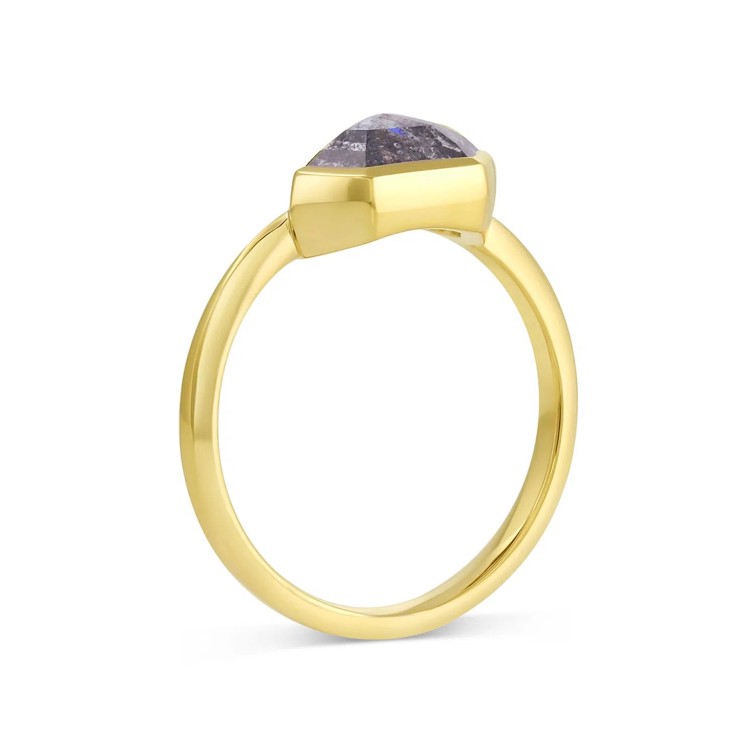 This ring features a 1.91ct shield salt & pepper diamond in a bezel setting. The ring is 14k yellow gold and size 6, but can be adjusted slightly if needed.