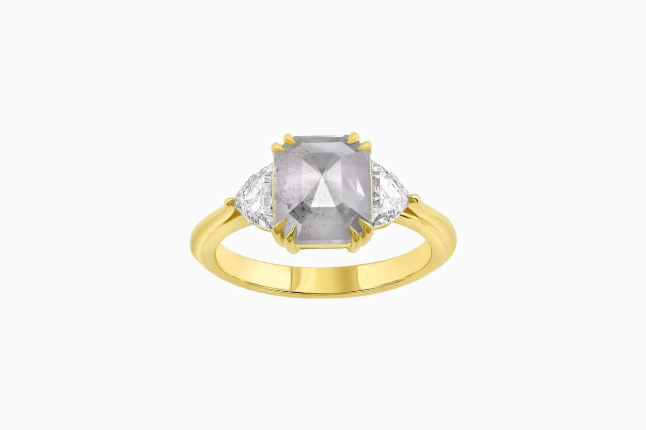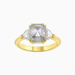 This ring features a 2.21ct silky gray emerald-cut salt and pepper diamond and is accented by two earth-mined epaulette-cut diamonds (G color, VS clarity) with a .51cttw. The ring is in 14k yellow gold and a size 5.5, but can be adjusted slightly if needed.