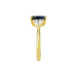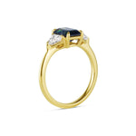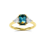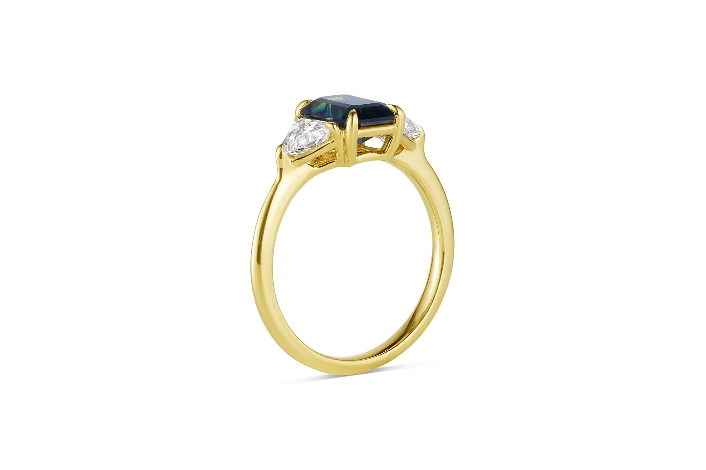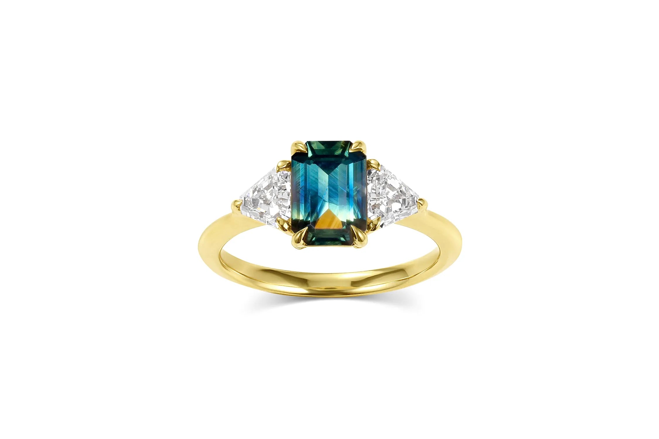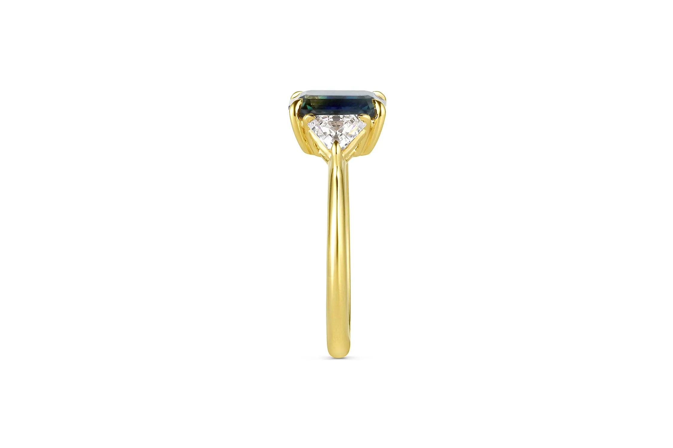 This ring features a 1.65ct emerald-cut natural green sapphire from Australia with calf-cut white diamond side stones (.7cttw). The ring is 14k yellow gold and a size 6, but can be adjusted slightly if needed.