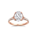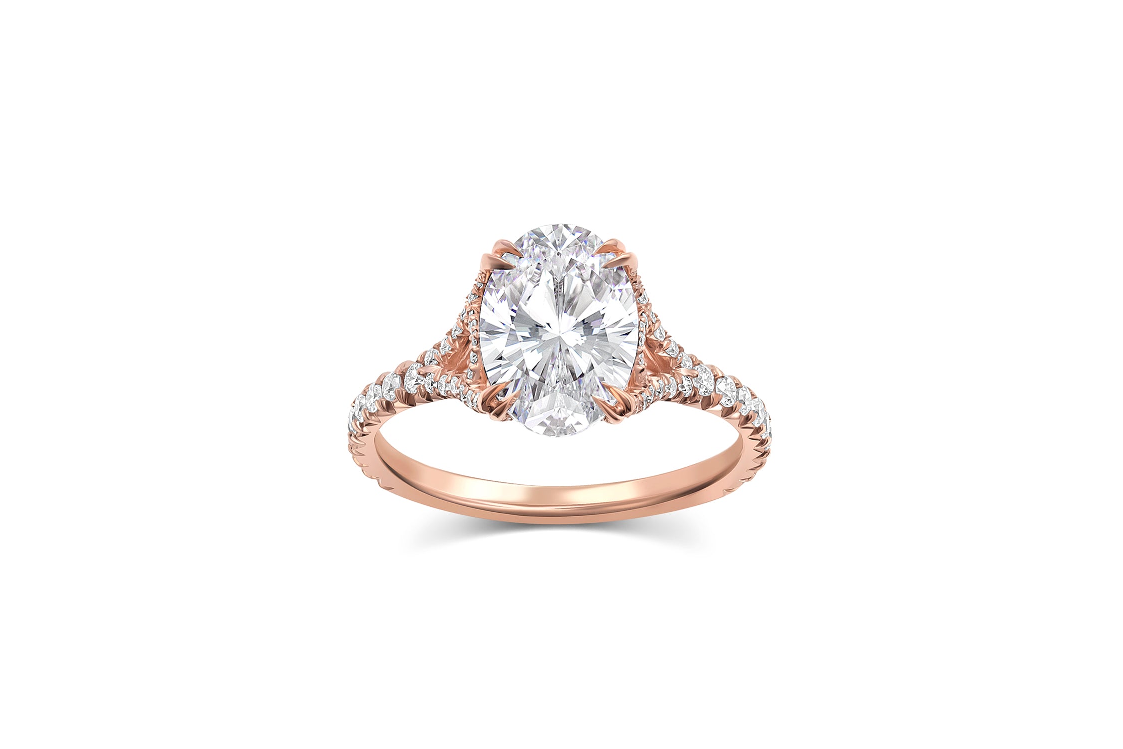 Our Samantha ring features a French setting with pave diamonds tailored to each center stone to ensure a correct and proportional fit. This setting accommodates a minimum center stone size of 2ct for all stone shapes.