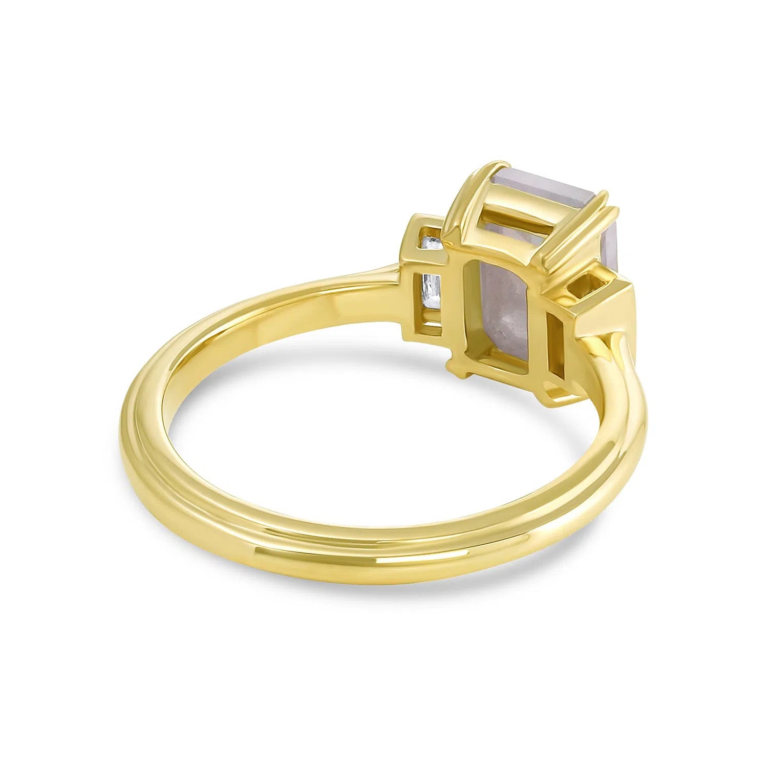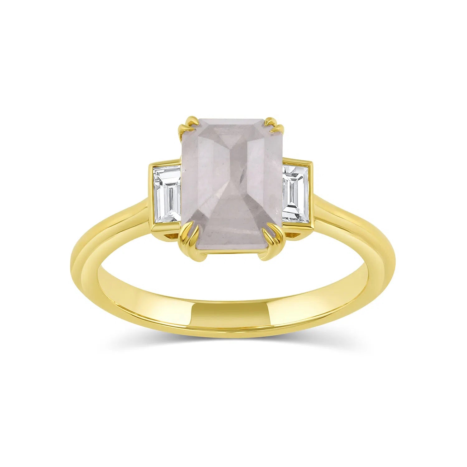 The engagement ring is shown with an Emerald-shaped rose-cut but can be adapted for any linear stone that has flat sides. The center stone is not included in the listed cost of Heather and is a separate charge. Please see our extensive selection of diamonds and sapphires for available options.