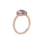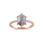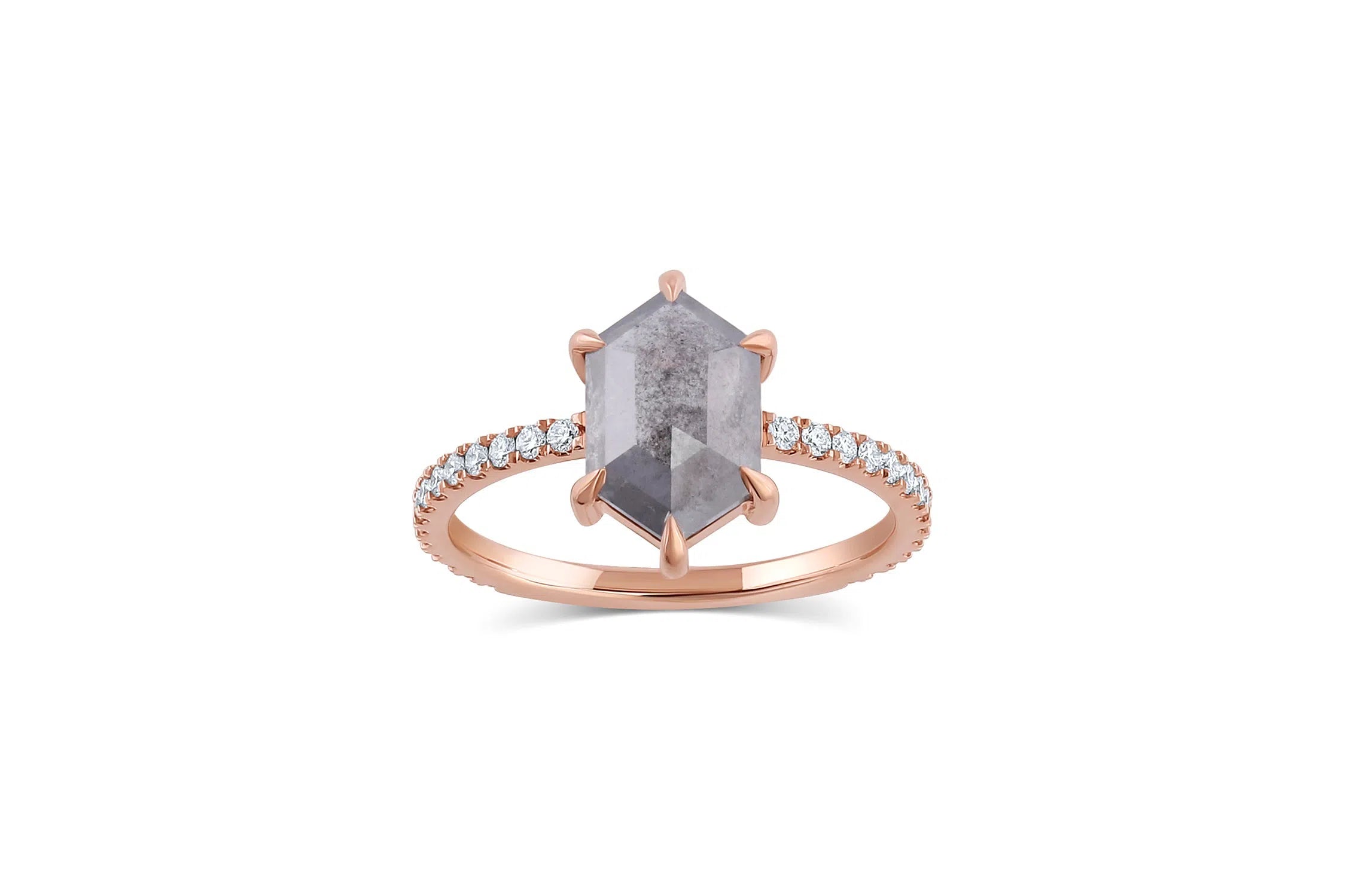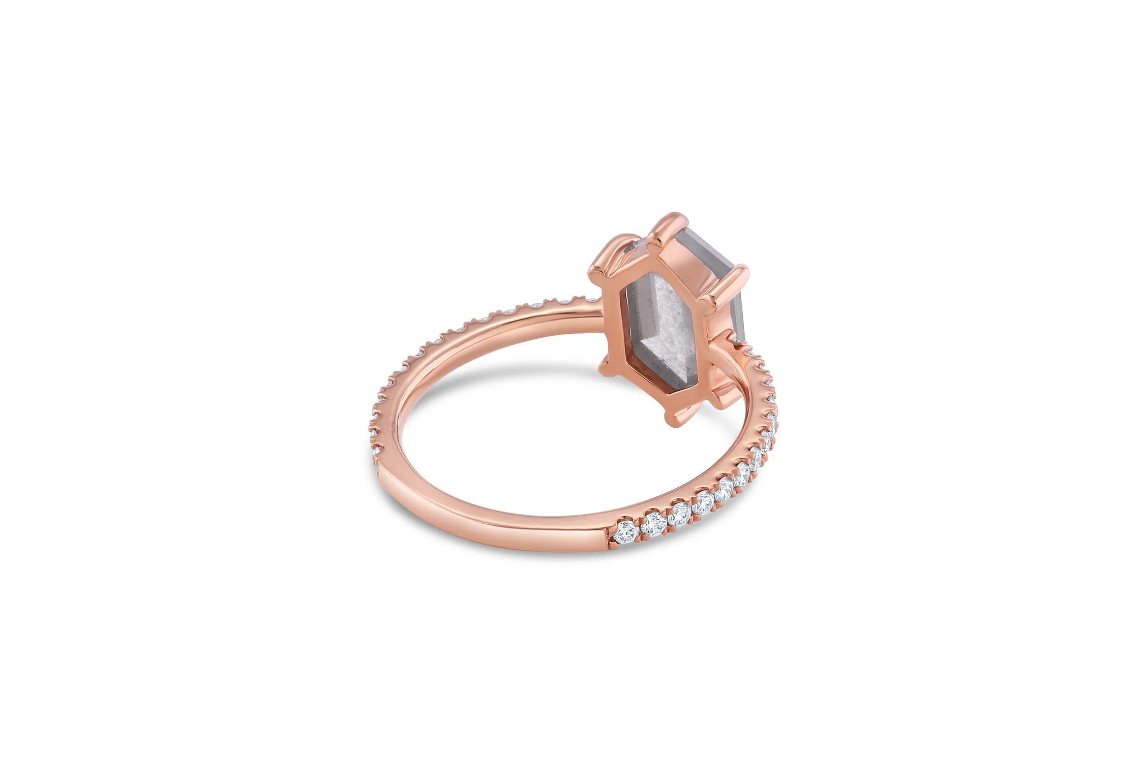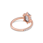 Pictured in 14k rose gold. The center stone in the example is a 10.5 x 6.5mm, 2.3ct Hexagon cut diamond.