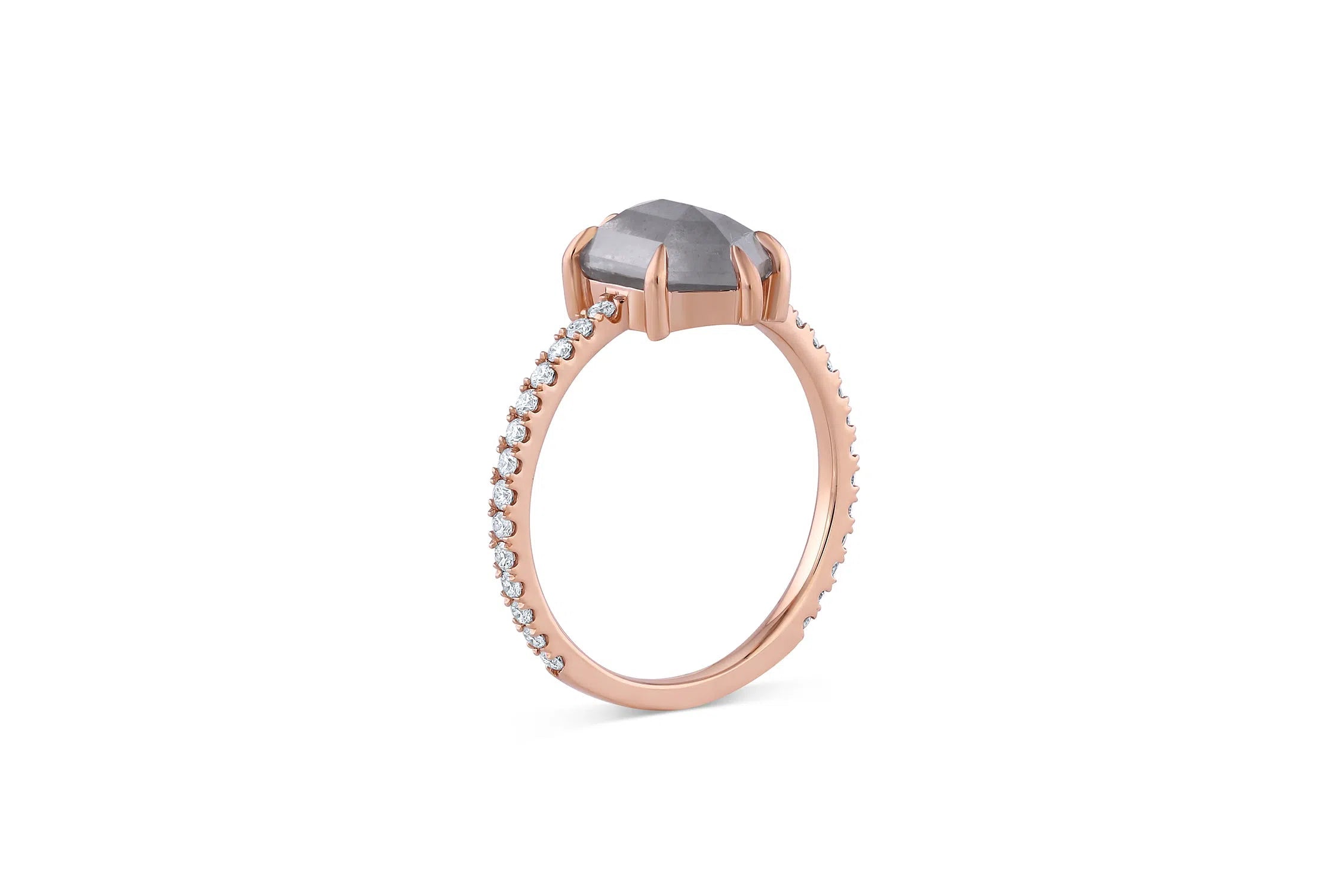 The example shown is with a Hexagon shape, rose-cut center stone, but can be adapted for any shape or size stone. The center stone is not included in the listed cost of Hope and is a separate charge. Please see our extensive selection of diamonds and sapphires for available options.