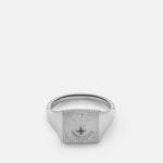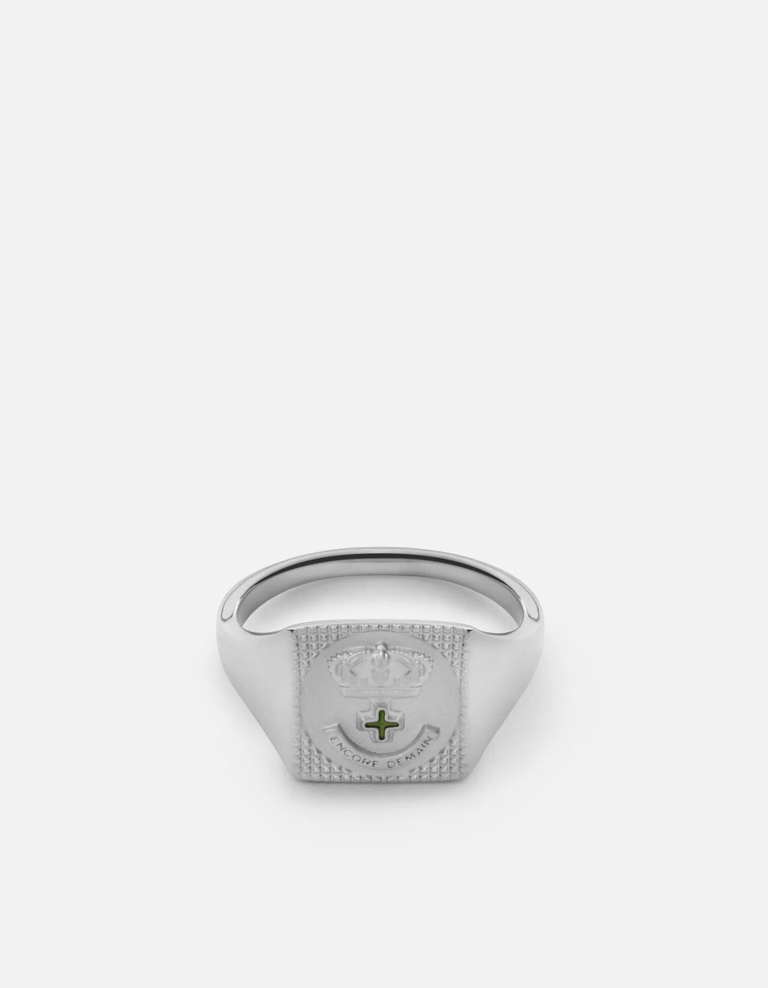 A hint of color gives our Lineage Ring subtle yet impactful style, perfect for today's minimalist. Highlighted by a mini cross in green enamel, the square-shaped ring is crafted in sterling silver and features the French phrase ÒEncore DemainÓ expertly etched on a raised ribbon. Because after all, tomorrow is another day.